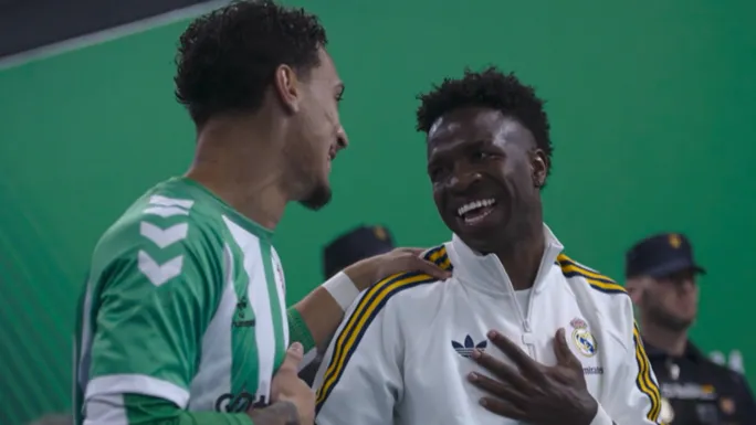 虎扑04月27日讯 据DAZN报道,在贝蒂斯对阵皇马的比赛前,转播镜头捕捉到了一段有趣的赛前画面。虽然维尼修斯和安东尼在西甲赛场上是对手,但两人在巴西国家队是队友,私下关系一直不错。